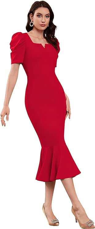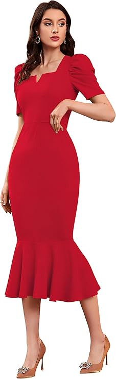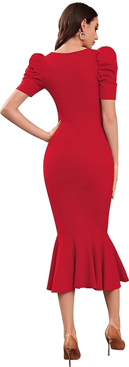 PATTERN: Solid/Plain | Closure: Pull On | Type: Bodycon One Piece | Neckline: Notch Neck | Sleeve Type: Puff Sleeve | Sleeve length: Half Sleeve | Waist line: High Waist | Hem Shaped: Round long.