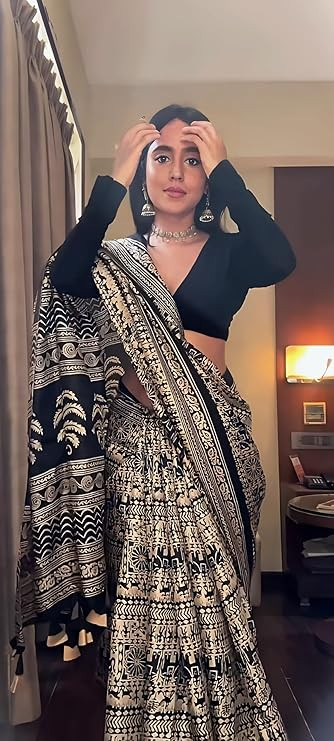 • Saree Details || Saree Fabric :- Art Silk | Saree Pattern :-Printed | Saree Work :- Tassel | Saree Length :- 5.5 Meter | Saree Type :-Kalamkar | Saree Color : Black ||